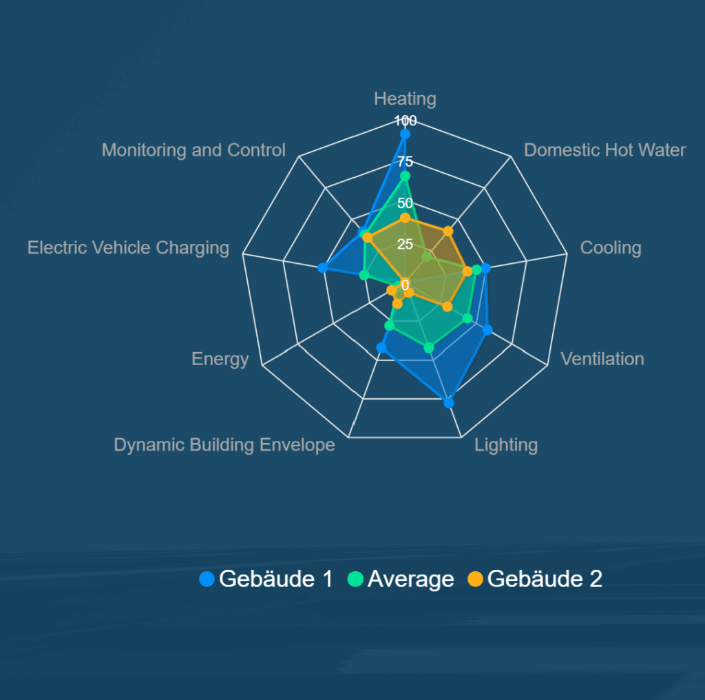Our interactive tool can calculate the Smart Readiness Indicator (SRI) and the degree of building automation in accordance with the Building Energy Act (GEG). The results are presented clearly and a digitization strategy is developed for the analyzed buildings.
